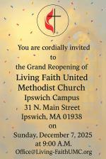 The Ipswich Living Light United Methodist Church reopened on Sunday Morning, December 7, 2025, at 9:00 am. This was the first service in the building since the ceiling collapsed several years ago. The sanctuary, fellowship hall, and other rooms have been completely restored and brought up to code, and will serve as a combined home for the Methodist Church and as the Ipswich Community House.